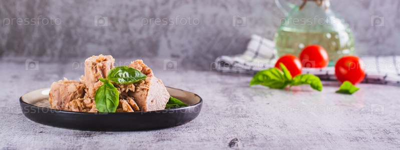 Кусочки консервированного тунца и листья базилика на тарелке веб-баннера
