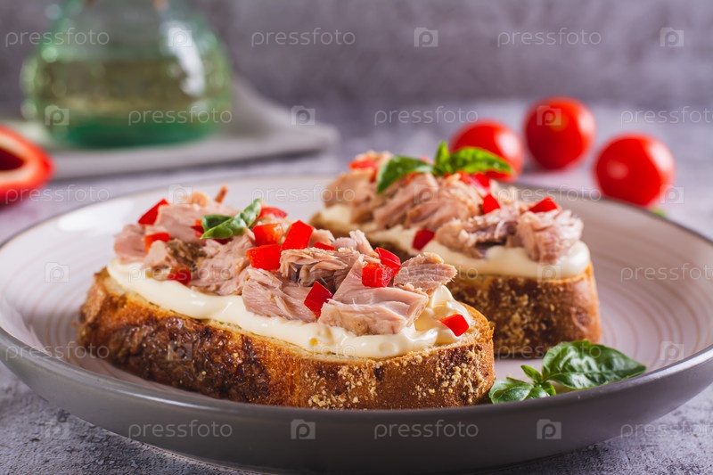 Открытые бутерброды с консервированным тунцом, перцем и базиликом на сливочном сыре на тарелке