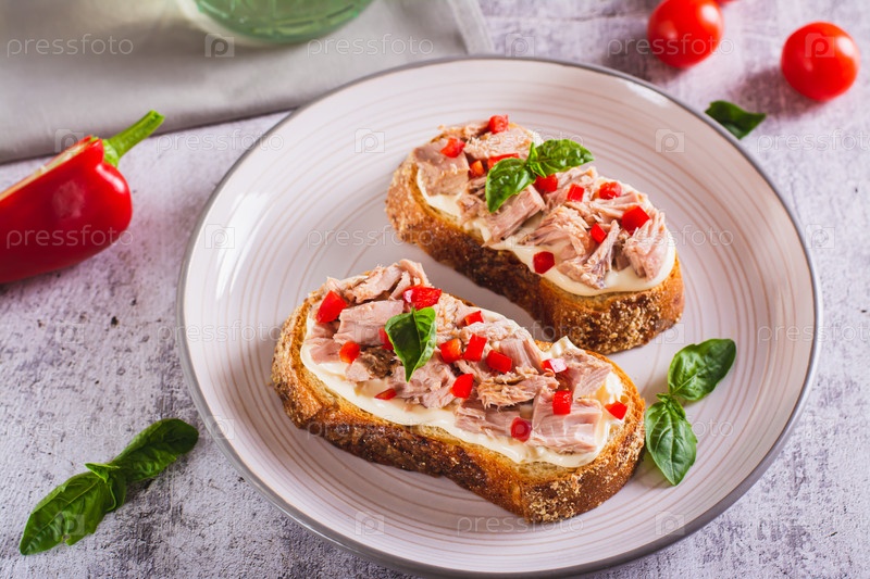 Тост с консервированным тунцом, сливочным сыром, перцем и зеленью на тарелке