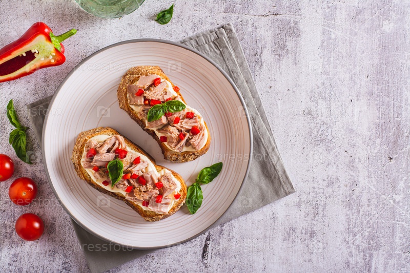 Открытые бутерброды с консервированным тунцом, перцем и базиликом на сливочном сыре на тарелке сверху