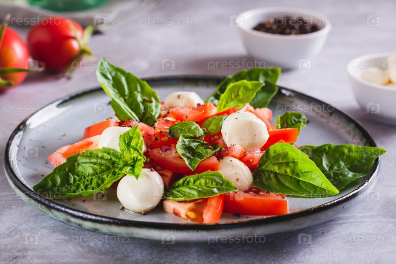 Салат Капрезе с помидорами, моцареллой, базиликом и оливковым маслом на тарелке