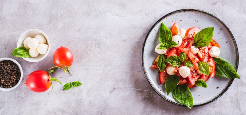 Вкусный салат капрезе со спелыми помидорами, сыром моцарелла и базиликом на тарелке, вид сверху, веб-баннер