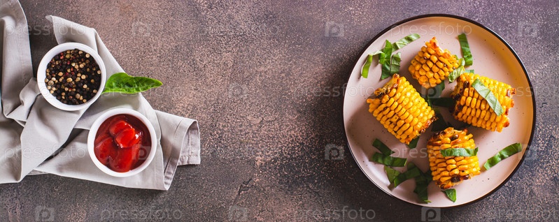 Жареная кукуруза со специями, маслом и чесноком на тарелке на веб-баннере с видом на стол