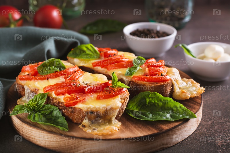 Запеченные бутерброды с салатом капрезе из помидоров и сыра на доске