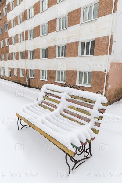 Россия. Республика Саха (Якутия), поселок Нижний Куранах. скамейка на фоне жилого дома. Россия. Республика Саха (Якутия), деревня Нижний Куранах. скамья на фоне жилого здания