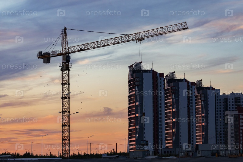 Россия. Санкт-Петербург. Подъемный строительный кран у строящегося жилого дома. Россия. Санкт-Петербург. Поднимающий строительный кран в строящемся жилом доме