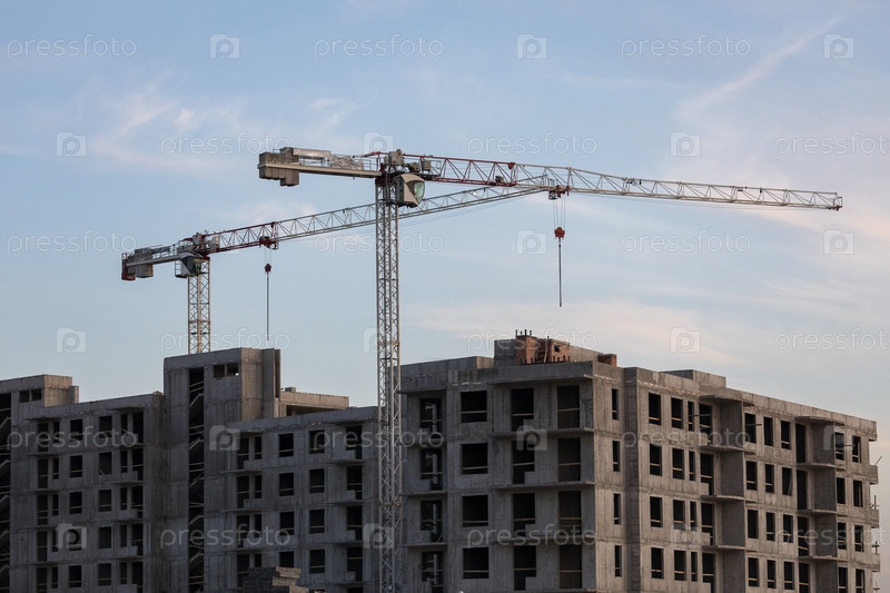 Россия. Санкт-Петербург. Подъемный строительный кран у строящегося жилого дома. Россия. Санкт-Петербург. Поднимающий строительный кран в строящемся жилом доме