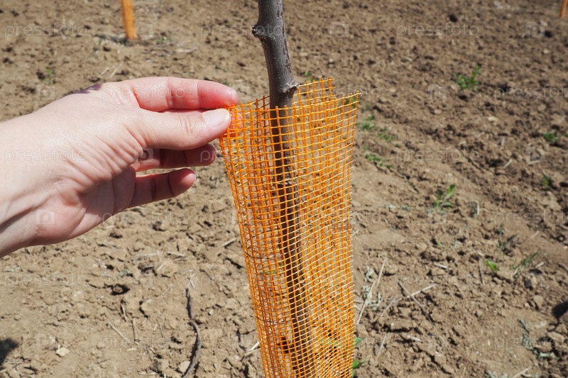 Саженец плодового дерева высаживают весной в садовую почву. Сезон посадки деревьев. Вспаханные поля на Фрушка-Горе, Сербия. Оранжевая защитная сетка поддерживает ствол и защищает от насекомых. Женская рука