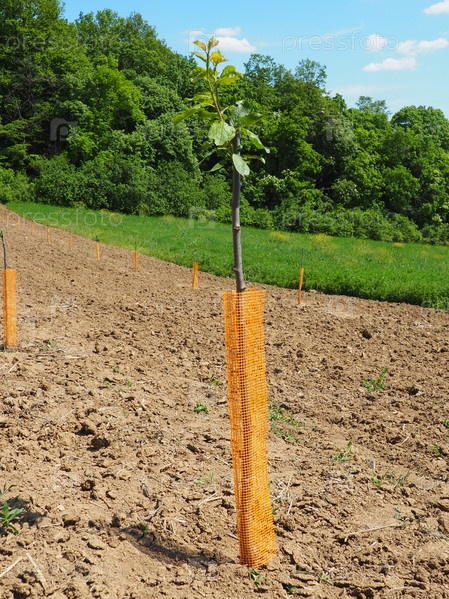 Саженец яблони высаживают в садовую землю весной, в лунку. Сезон посадки деревьев. Вспаханные поля на Фрушка-Горе, Сербия. Оранжевая защитная сетка поддерживает ствол и защищает от насекомых