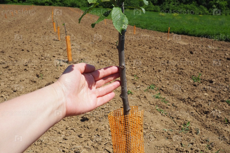 Саженец яблони высаживают весной в садовую землю. Сезон посадки деревьев. Вспаханные поля на Фрушка-Горе, Сербия. Оранжевая защитная сетка поддерживает ствол и защищает от насекомых. Женская рука