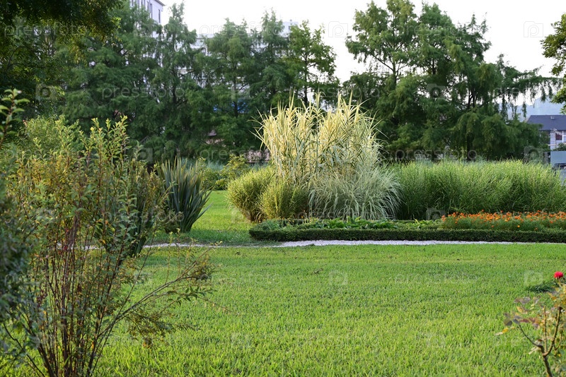Ландшафтный дизайн в зеленом саду, панорамный вид на благоустроенный двор жилого дома. Мощение дорожки, растения и старинный фонарь на заднем дворе дома, красивый ландшафт летом