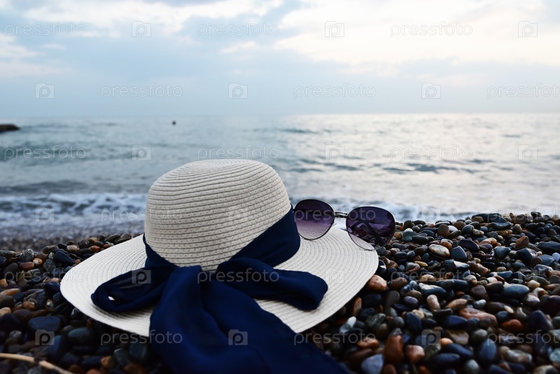 Солнцезащитные очки и шляпа на пляже. концепция путешествия