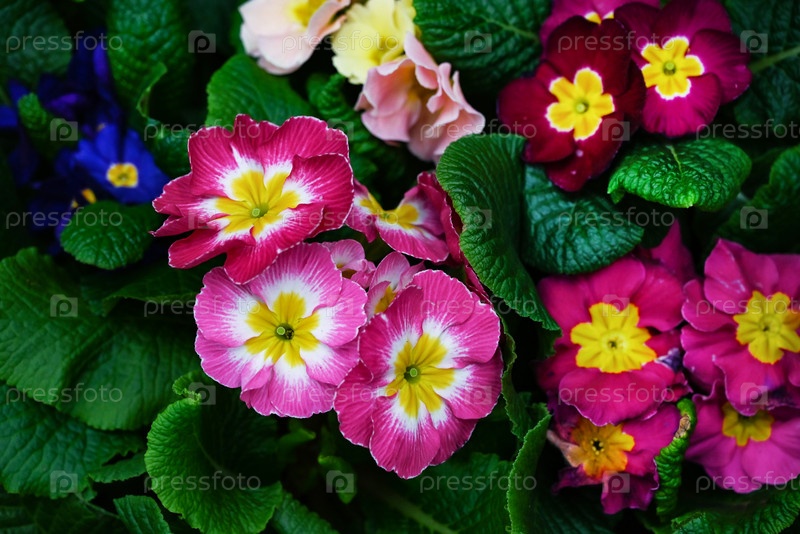 Панорамный многоцветный цветок первоцвета Primula vulgaris. Многоцветная Country Primula, вид сверху. Яркий цветочный пейзаж, плоская планировка. Живая стена из Примулы Примулы разноцветные цветы