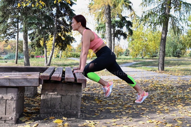 Спортсмен в удобной спортивной одежде. Фитнес на свежем воздухе в городе. Здоровый образ жизни. Упражнения тренера на улице. Уверенная в себе женщина тренируется