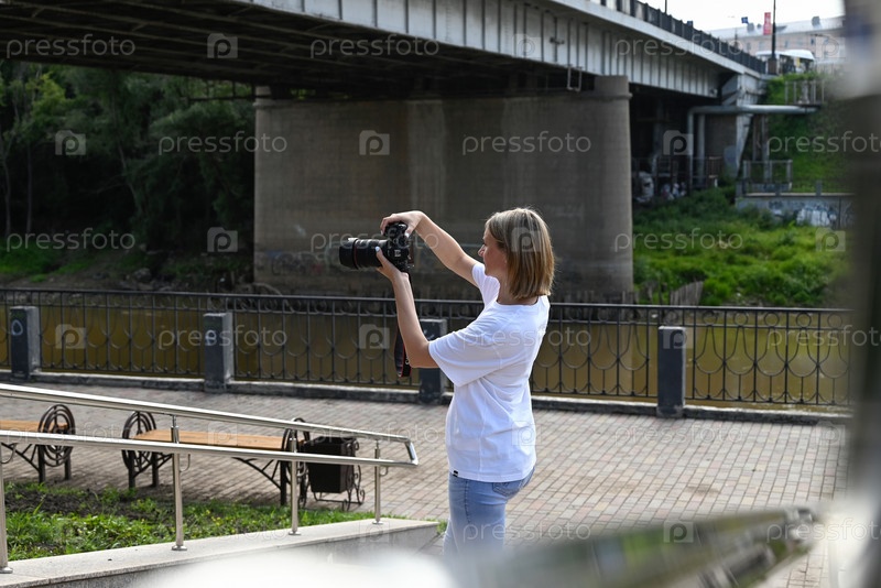 Женщина-фотограф с камерой в руках ходит по улицам города