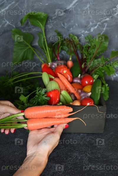 Овощные культуры в овощных культурах в ящике, ящик для еды, крупный план для еды