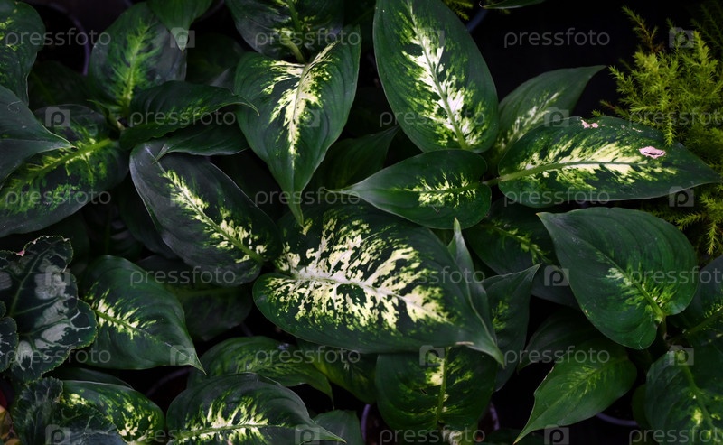 Цветочные горшки с диффенбахией в цветочном магазине. Баннер