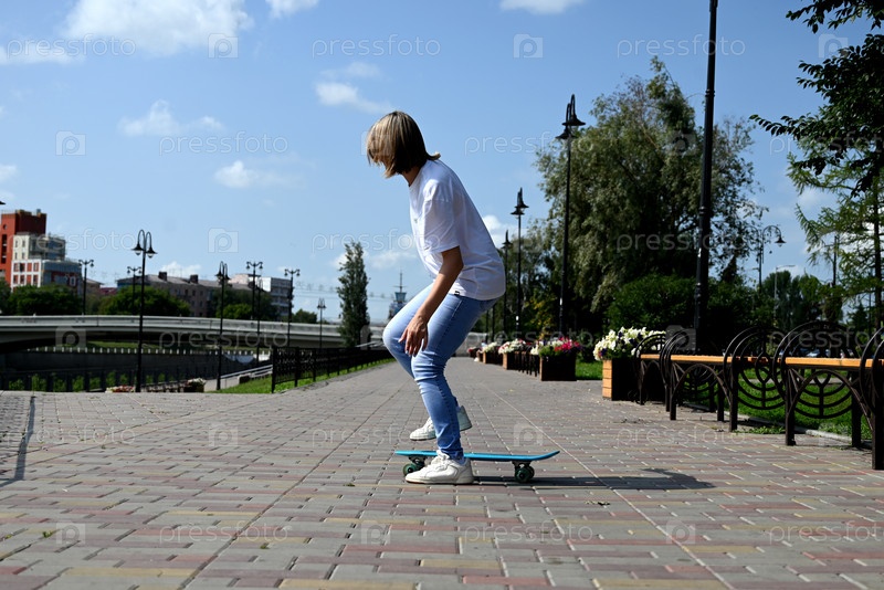 Активная женщина средних лет едет на скейтборде по пустой дороге или шоссе. Обычная городская женщина отдыхает на скейтборде после работы. Концепция современного образа жизни