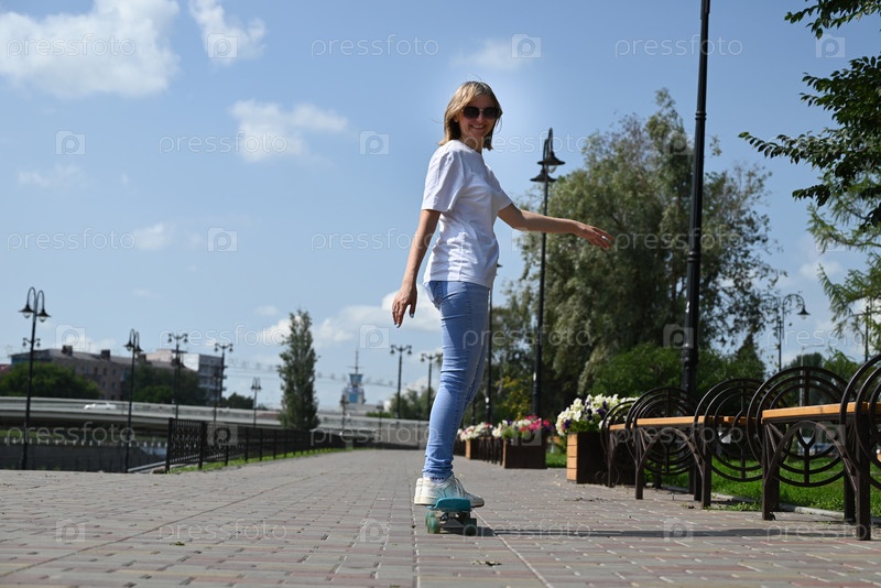 Активная женщина средних лет едет на скейтборде по пустой дороге или шоссе. Обычная городская женщина отдыхает на скейтборде после работы. Концепция современного образа жизни