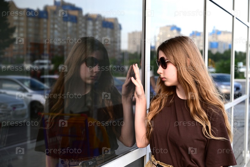 Девочка-подросток в солнечных очках смотрит на отражение в стекле