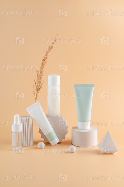 Набор косметических средств сжимает тюбики, капельницы и бутылки с тонером на бетонных подиумах на бежевом фоне. Набор для ежедневного ухода за кожей. Мокап для дизайнеров