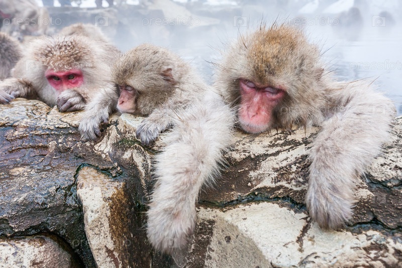Группа снежных обезьян, спящих в горячем источнике в Дзигокудани Яэн-Коэн, префектура Нагано, Япония