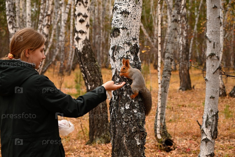 Девушка кормит дикую белку из рук, парк, лес, день