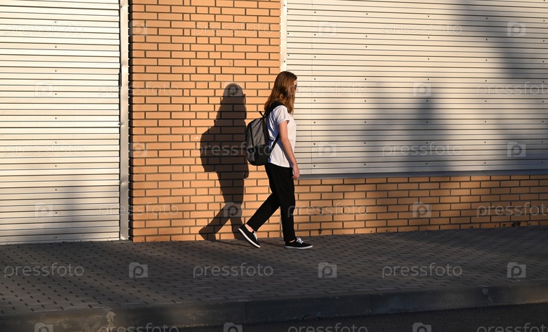 Девочка-подросток в черных брюках и белой футболке идет по улице с черным рюкзаком на спине