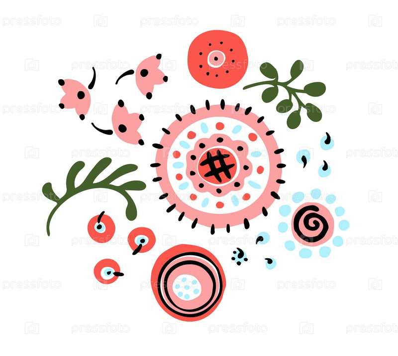 Набор этнических элементов. Бордюр представляет собой полосу с цветами, листьями, ветками, вензелями. Народная вышивка. Славянский, украинский, русский мотив. Хохлома, матрешка, дымковская игрушка. Мексиканский, индийский, цыганский ковер. Вязаное кружево