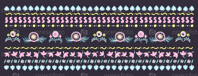 Набор этнических элементов. Бордюр представляет собой полосу с цветами, листьями, ветками, вензелями. Народная вышивка. Славянский, украинский, русский мотив. Хохлома, матрешка, дымковская игрушка. Мексиканский, индийский, цыганский ковер. Вязаное кружево