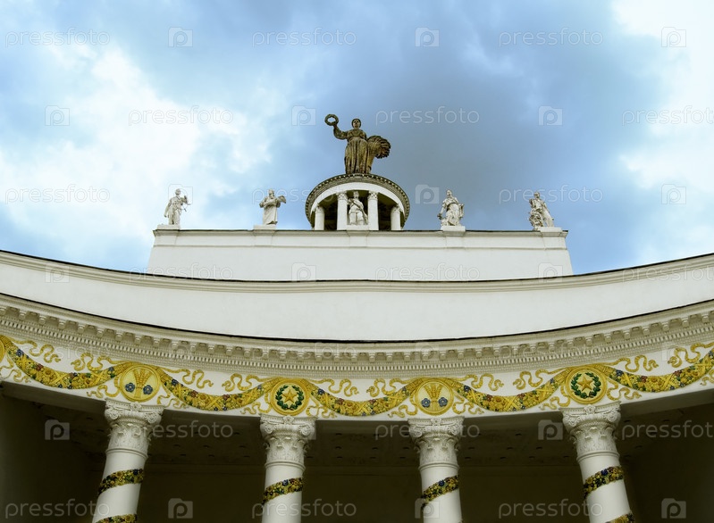 Выставочный зал электротехники на фоне облачного неба