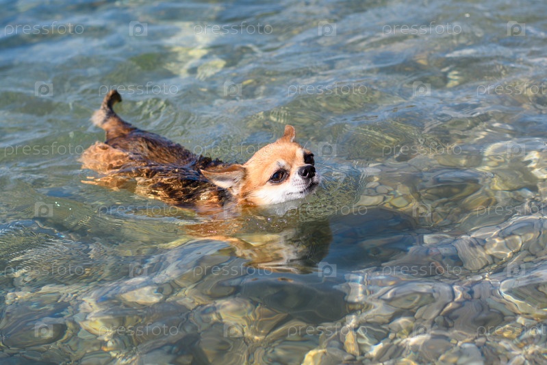 Маленькая собака плавает в морской воде. Собака чихуахуа плавает в море