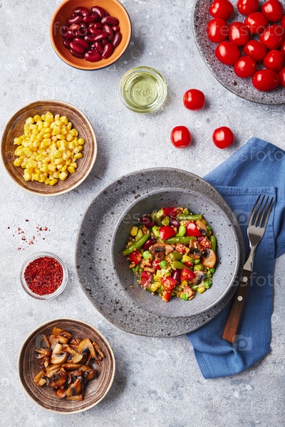 Киноа со стручковой фасолью, помидорами, жареными шампиньонами, кукурузой, красным сладким перцем, горошком и соей. Полезная овощная смесь