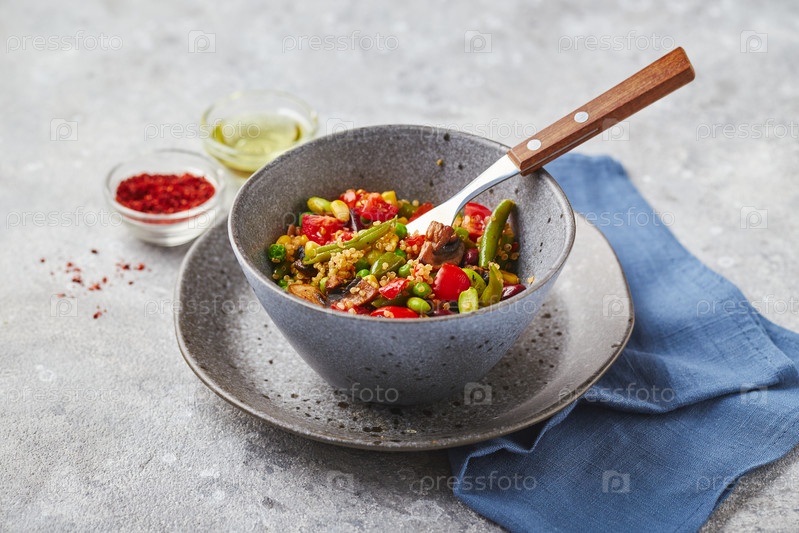 Киноа со стручковой фасолью, помидорами, жареными шампиньонами, кукурузой, красным сладким перцем, горошком и соей. Полезная овощная смесь