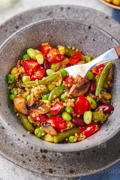 Киноа со стручковой фасолью, помидорами, жареными шампиньонами, кукурузой, красным сладким перцем, горошком и соей. Полезная овощная смесь