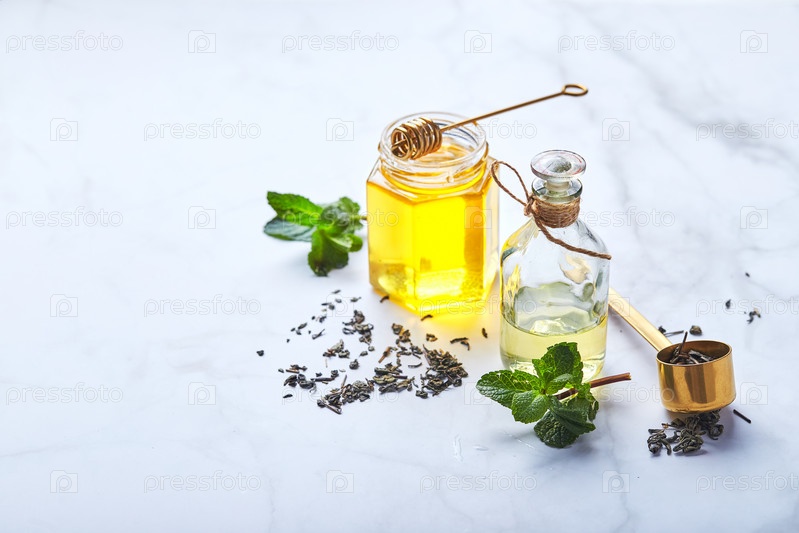 Бутылка эфирного масла мяты и зеленых листьев и банка меда. Натуральные органические ингредиенты для косметики, ухода за кожей, ухода за телом. Концепция ухода за красотой