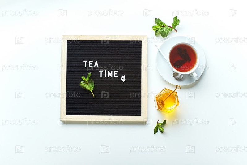 Время чая. Черная доска для писем с текстом на мраморном столе со стеклянной чашкой чая с листьями мяты