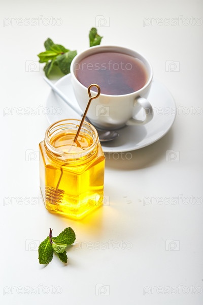 Черный чай в белой чашке с листьями мяты и медом. Успокаивающий и восстанавливающий чай, антистресс и релакс