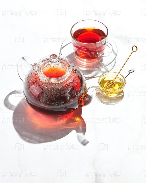 Фруктовый чай с яблоками, тимьяном и медом в стеклянном чайнике и чашке на белом фоне с жесткими тенями