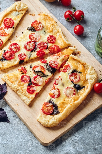 Тарт из слоеного теста с помидорами черри, моцареллой и фиолетовым базиликом