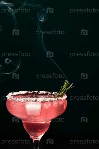Алкогольный или безалкогольный коктейль типа маргарита со льдом и дымящейся веткой розмарина на темном фоне
