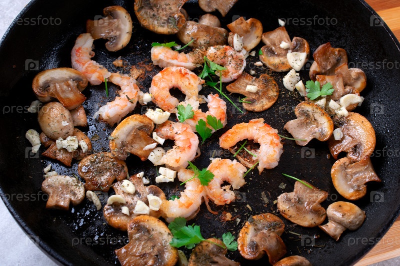 Готовим креветки с шампиньонами и чесноком на сковороде. Приготовление блюда из морепродуктов