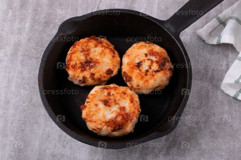 Приготовление котлет с треской и креветками на чугунной сковороде. Вид сверху