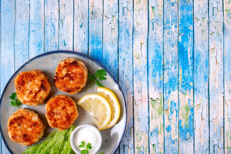 Котлеты с треской и креветками подаются с листьями салата, лимоном и сметанным соусом на тарелке на синем деревянном столе. Вид сверху. Копировать пространство