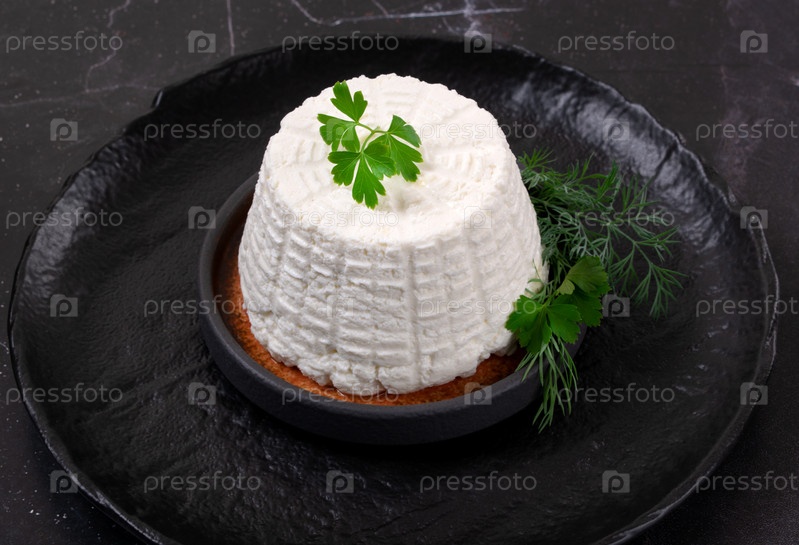 Свежий сыр рикотта с петрушкой на темном столе. итальянская кухня