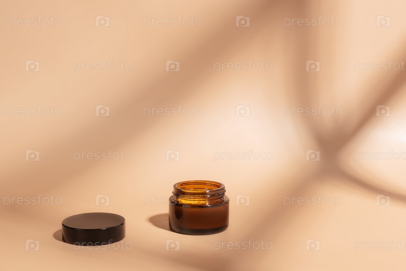 Банка янтарного стекла для косметики на коричневом фоне с тенью. Мокапы контейнера с увлажняющим кремом для лица, рук, крупным планом. Концепция ухода за телом