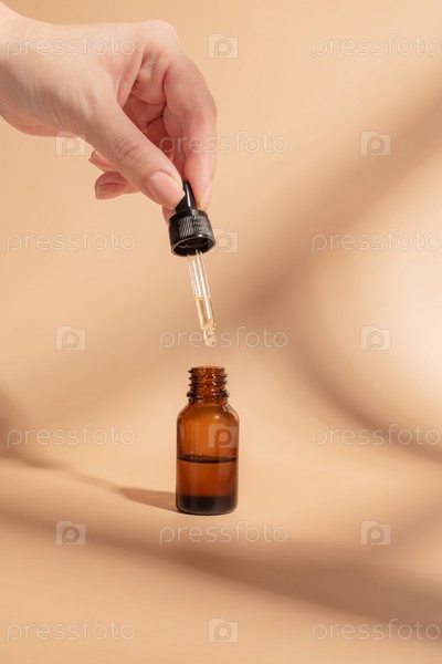 Женская рука с капельницей эфирного масла, ароматерапевтической эссенцией, косметической сывороткой или лекарственной жидкостью на бежевом фоне. Небрендовые бутылки для вашего дизайна
