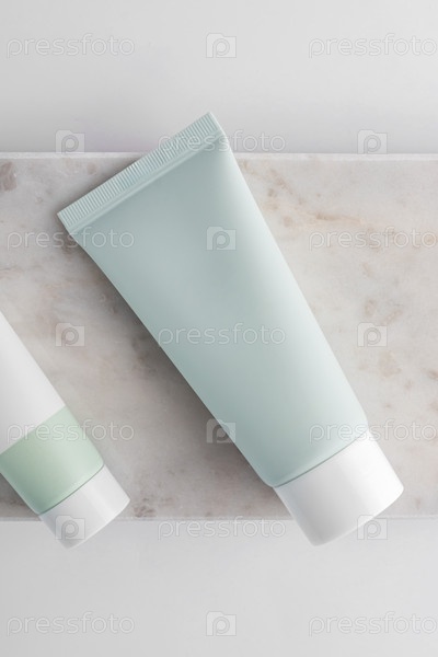 Концепция косметологии и хорошего самочувствия. зеленый тюбик с увлажняющим лосьоном для тела. Макет оригинальной бутылочки для ухода за кожей на мраморном подносе