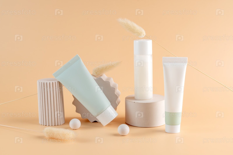 Группа белых и зеленых пустых косметических кремовых банок и тюбиков без бренда на бежевом фоне на бетонных подиумах. Презентация средств по уходу за кожей. Элегантный макет. Уход за кожей, красота и спа