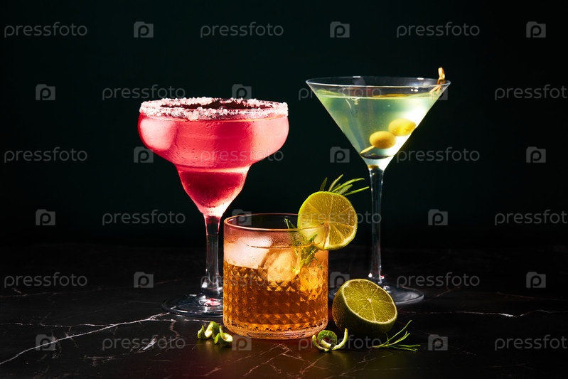 Алкогольные и безалкогольные коктейли на темном мраморном столе. Летние закуски